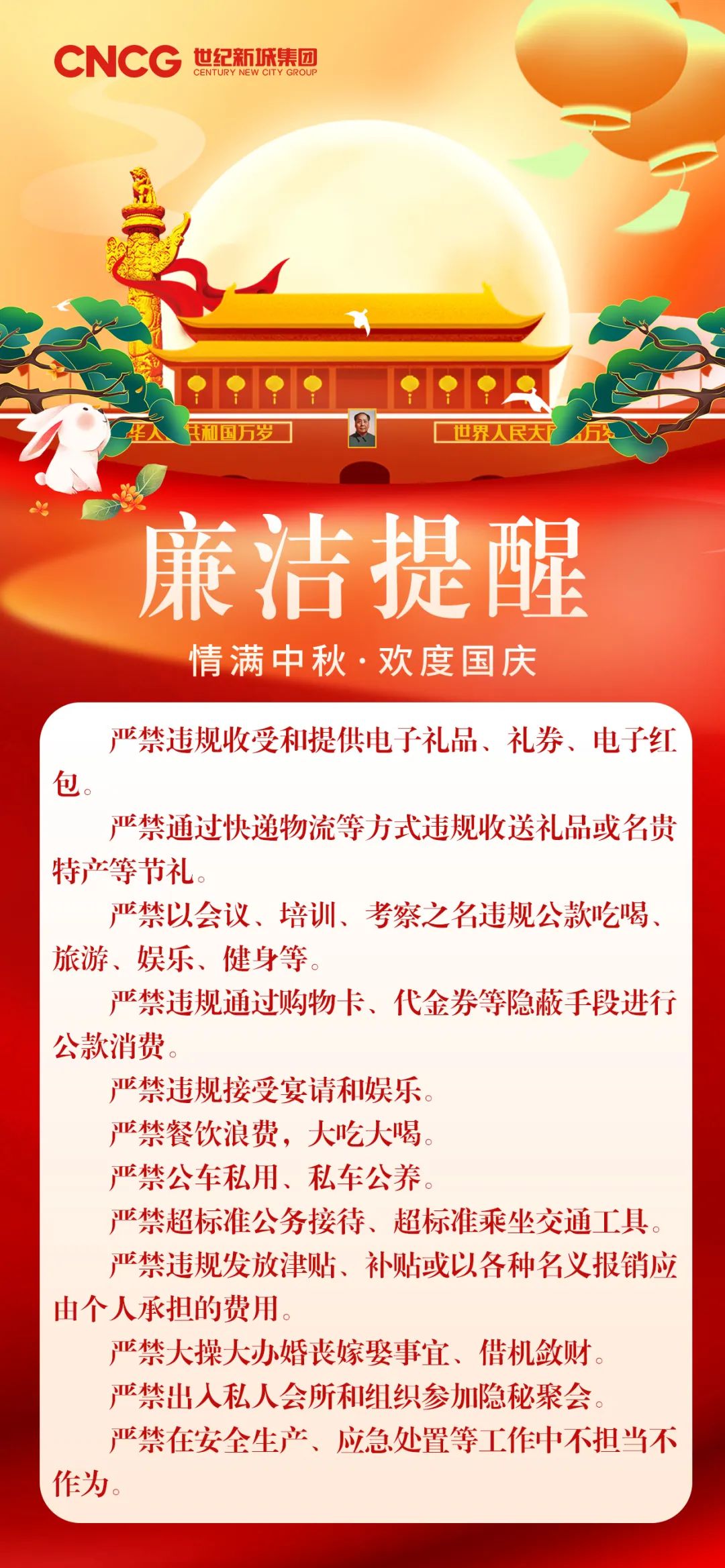 “中秋”“國(guó)慶”雙節(jié)將至,為進(jìn)一步加強(qiáng)中央八項(xiàng)規(guī)定精神落實(shí),持之以恒糾治“四風(fēng)”,世紀(jì)新城集團(tuán)紀(jì)委提醒廣大黨員干部和職工群眾:把過節(jié)當(dāng)做錘煉廉潔觀、弘揚(yáng)文明觀的磨刀石,自覺遵規(guī)守紀(jì)、抵制“四風(fēng)”頑疾,杜絕違法違紀(jì)行為,做到心中常放一把戒尺,眼前??匆桓t線,耳邊常鳴一口警鐘,身邊常沐一縷“清”風(fēng),過一個(gè)清正、廉潔、祥和的節(jié)日。