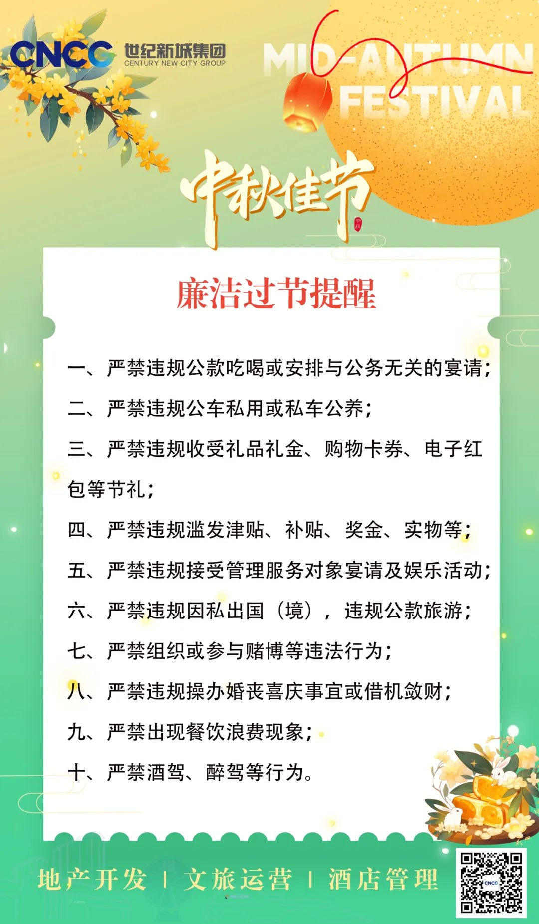 風(fēng)清氣正度中秋,清風(fēng)廉韻迎國慶。中秋佳節(jié)將近,世紀(jì)新城集團(tuán)紀(jì)委溫馨提示:節(jié)日期間勿忘廉潔自律,全體黨員干部職工要崇廉尚儉,時刻將紀(jì)律和規(guī)矩挺在前面,守住底線,不碰紅線,共同營造風(fēng)清氣正的節(jié)日氛圍。