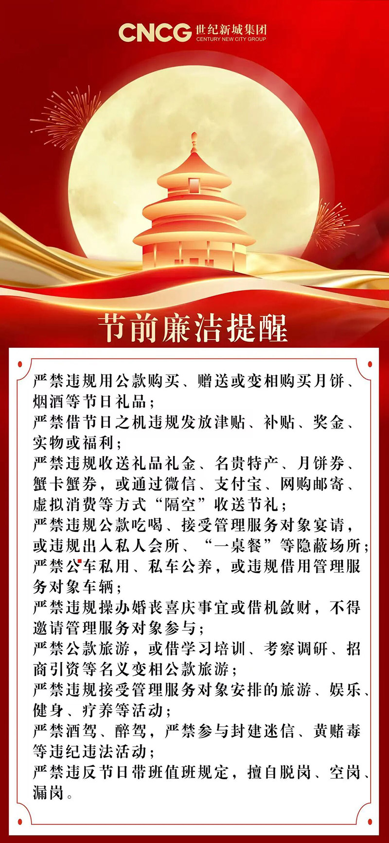清風伴佳節(jié),廉潔守初心,2025年國慶、中秋“雙節(jié)”將至,為持續(xù)推進作風建設(shè)常態(tài)化長效化,馳而不息糾“四風”樹新風,營造風清氣正的節(jié)日氛圍,世紀新城集團紀委提醒全體黨員干部職工:守紀律、明底線、知敬畏,時刻繃緊紀律規(guī)矩這根弦,讓節(jié)日清風常駐、正氣長存。