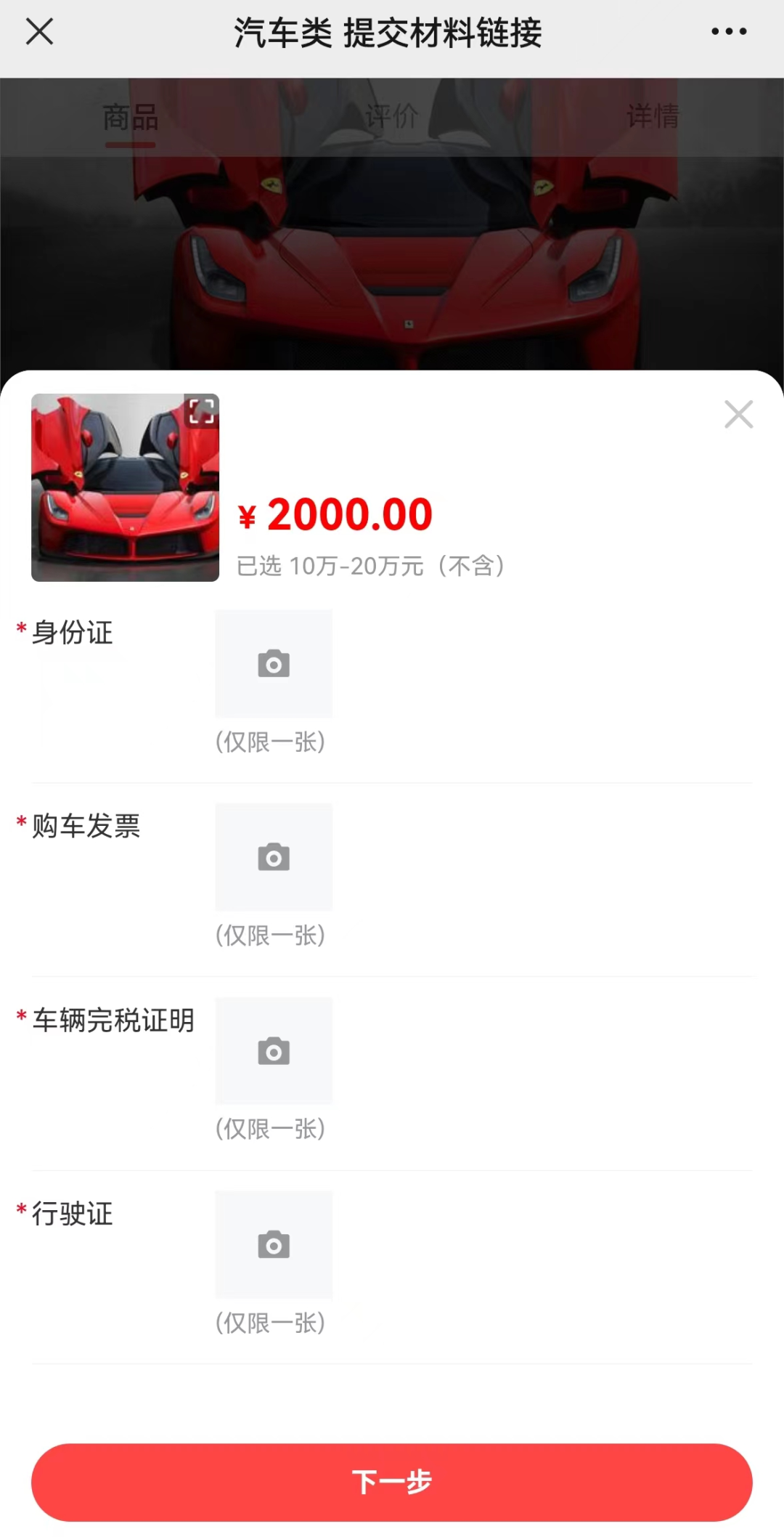 2、按照票面金額(不含稅價)選取車價區(qū)間,填寫手機(jī)號碼、姓名,上傳身份證照片、購車發(fā)票照片、車輛完稅證明照片、行駛證照片,點(diǎn)擊“下一步”。