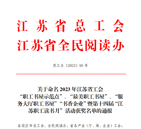 喜訊!集團(tuán)榮獲2023年江蘇省工會(huì)“職工書屋示范點(diǎn)”榮譽(yù)稱號(hào)!