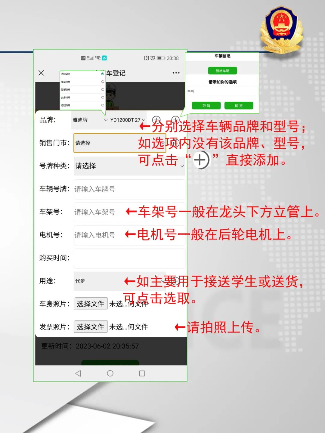 第3步:按照要求,填寫車輛品牌和型號;選擇“銷售門市、號牌種類”,輸入車輛號牌、車架號、電機號,以及購買時間、用途,最后選擇上傳車身照片以及購車發(fā)票。