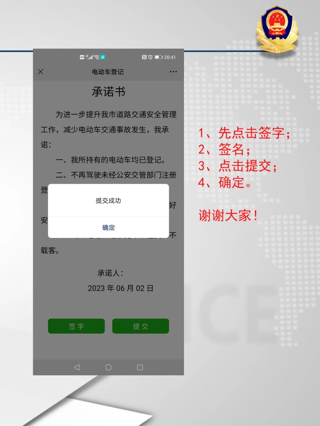 第5步:仔細閱讀承諾書,讀完后點擊“簽字”,隨后簽名,簽名完成后,再點擊“提交”按鈕,完成全部電動車登記工作。