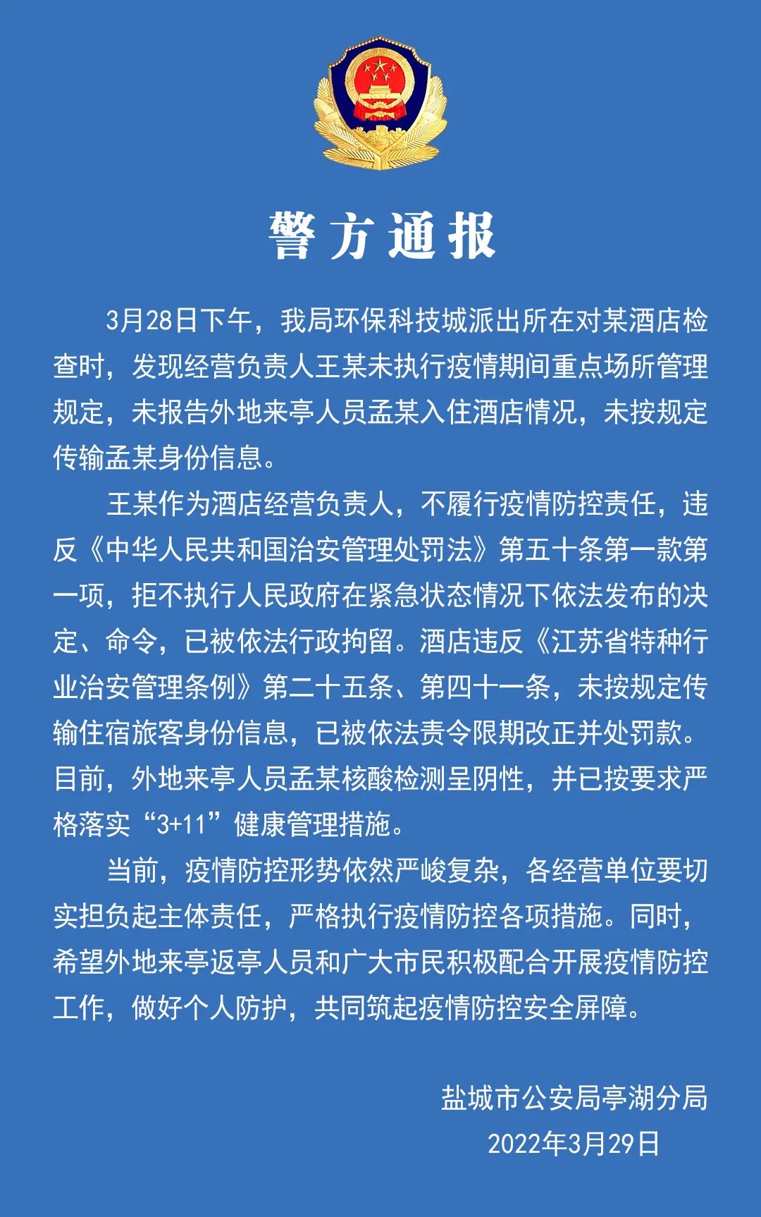 王某作為酒店經(jīng)營(yíng)負(fù)責(zé)人,不履行疫情防控責(zé)任,違反《中華人民共和國(guó)治安管理處罰法》第五十條第一款第一項(xiàng),拒不執(zhí)行人民政府在緊急狀態(tài)情況下依法發(fā)布的決定、命令,已被依法行政拘留。酒店違反《江蘇省特種行業(yè)治安管理?xiàng)l例》第二十五條、第四十一條,未按規(guī)定傳輸住宿旅客身份信息,已被依法責(zé)令限期改正并處罰款。目前,外地來(lái)亭人員孟某核酸檢測(cè)呈陰性,并已按要求嚴(yán)格落實(shí)“3+11”健康管理措施。