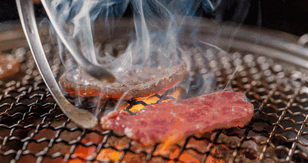 寫火焰在烤肉架上跳動,煙霧裊裊升起,
