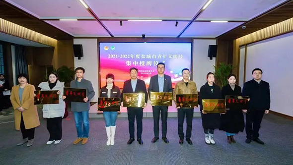 圖為2021-2022年度鹽城市“青年文明號(hào)”集中授牌儀式,右五為地產(chǎn)公司工程部