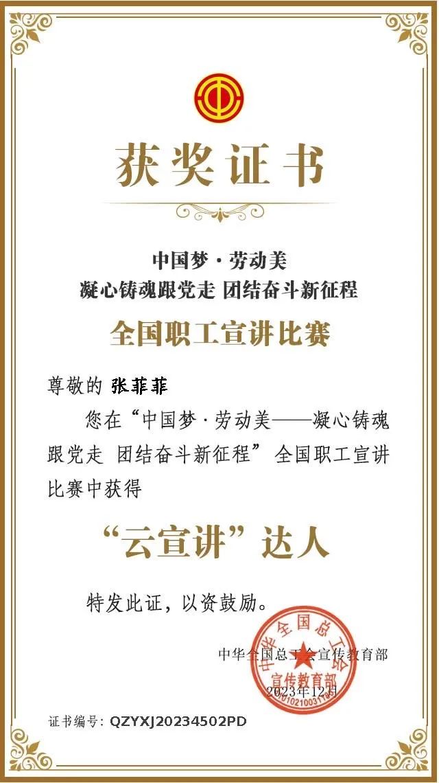 喜報!集團職工張菲菲榮獲全國職工宣講比賽“云宣講”達人稱號