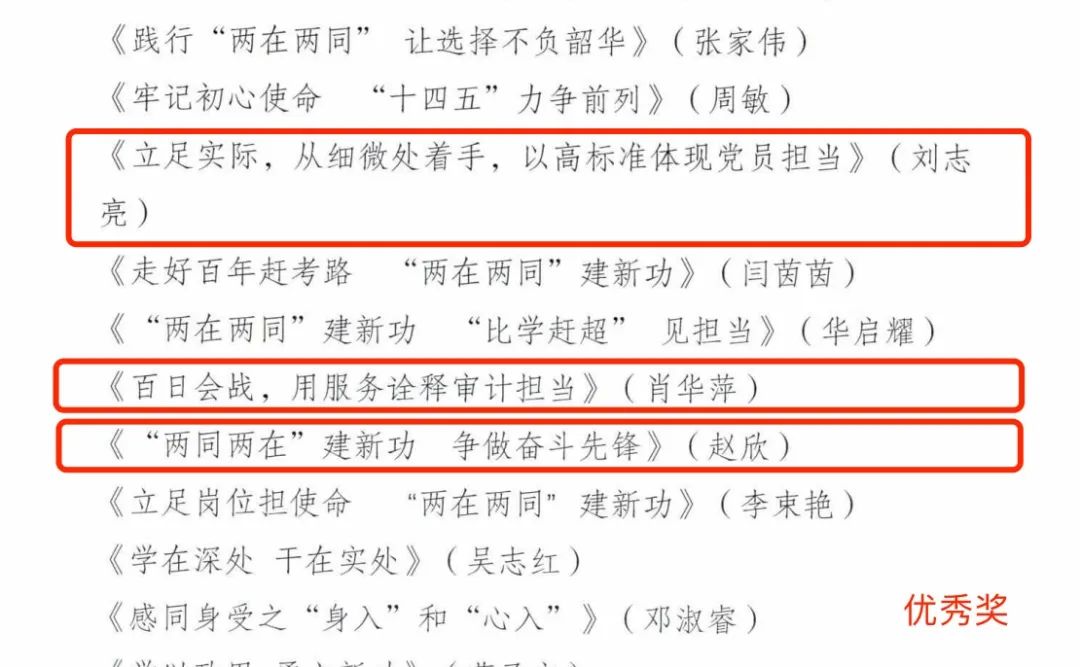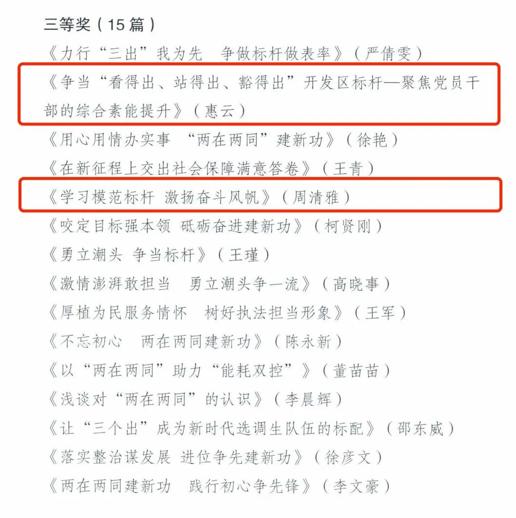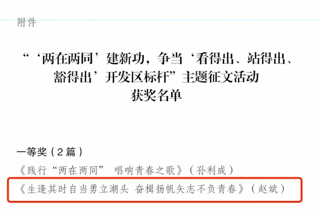 本次獲獎作品中:集團(tuán)紀(jì)委趙斌作品《生逢其時自當(dāng)勇立潮頭奮揖揚(yáng)帆矢志不負(fù)青春》榮獲一等獎,地產(chǎn)公司惠云作品《爭當(dāng)“看得出、站得出、豁得出”開發(fā)區(qū)標(biāo)桿一聚焦黨員干部的綜合素能提升》、融資部周清雅作品《學(xué)習(xí)模范標(biāo)桿激揚(yáng)奮斗風(fēng)帆》榮獲三等獎,審計部肖華萍作品《百日會戰(zhàn),用服務(wù)論釋審計擔(dān)當(dāng)》、財務(wù)部劉志亮作品《立足實(shí)際,從細(xì)微處著手,以高標(biāo)準(zhǔn)體現(xiàn)黨員擔(dān)當(dāng)》、招標(biāo)部趙欣作品《“兩同兩在”建新功,爭做奮斗先鋒》榮獲優(yōu)秀獎。