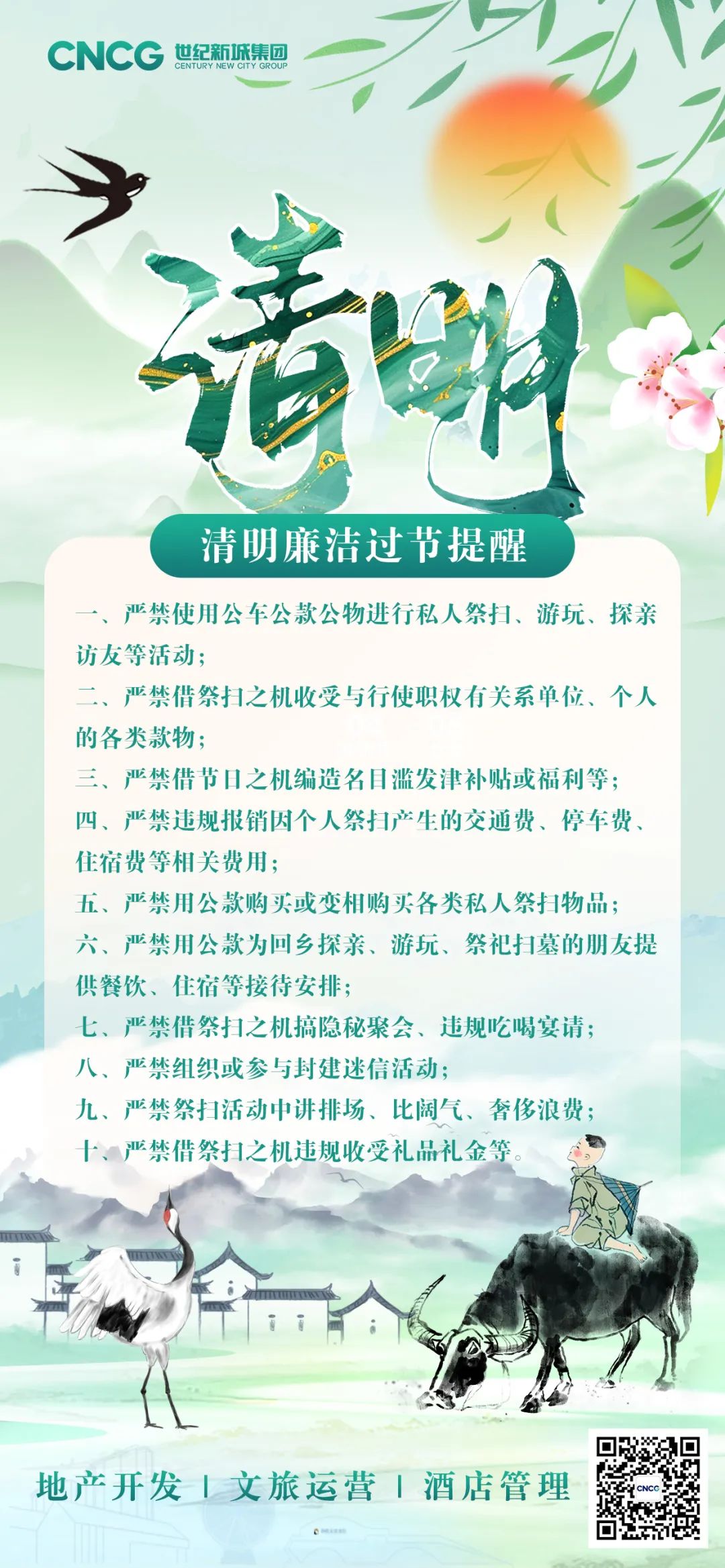 又是一年春草綠,又到一年清明時(shí)。清明節(jié)是中華民族緬懷英烈、悼念先人、寄托哀思、傳承文化的傳統(tǒng)節(jié)日。為鍥而不舍落實(shí)中央八項(xiàng)規(guī)定精神,嚴(yán)防“四風(fēng)”回潮反彈,江蘇世紀(jì)新城集團(tuán)紀(jì)委溫馨提醒全體干部職工要自覺把好“廉潔關(guān)”,時(shí)刻繃緊紀(jì)律規(guī)矩之弦,文明低碳祭掃,弘揚(yáng)新風(fēng)正氣,讓清明之節(jié)更“清明”。特發(fā)出如下倡議: