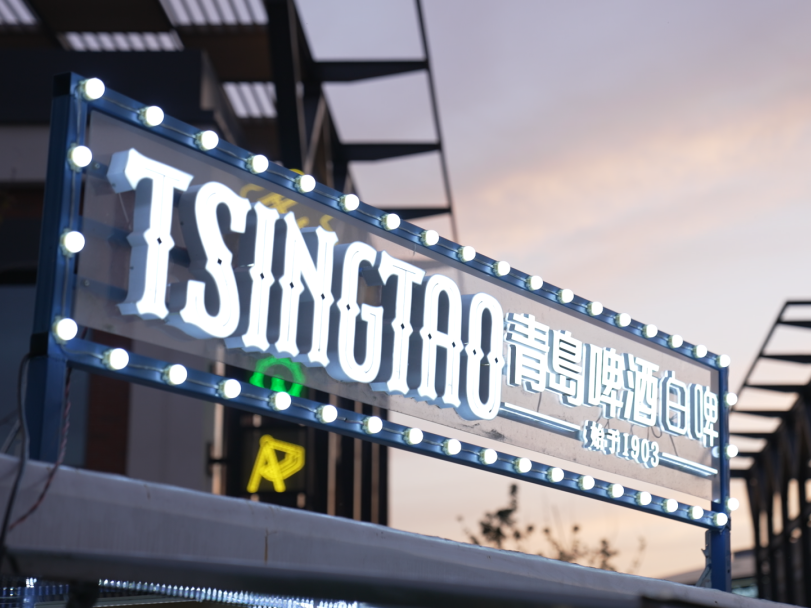 燒烤啤酒在霓虹燈球的照映下