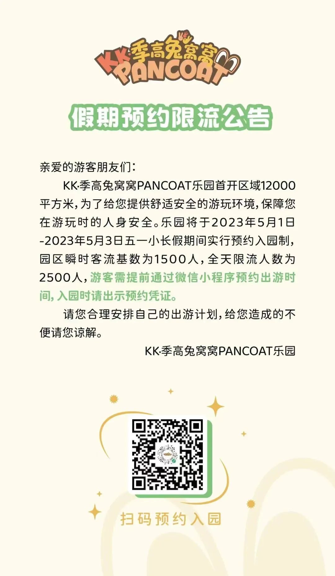 特別注意:開園火爆,5月1日-3日,KK·季高兔窩窩PANCOAT樂(lè)園全天限流人數(shù)為2500人,入園需出示預(yù)約憑證。