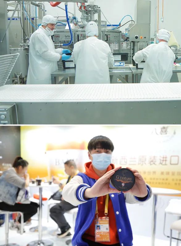 這是一張拼版照片,上圖為艾萊發(fā)喜新西蘭公司員工在冰激凌生產(chǎn)線上工作(資料照片,新華社發(fā));下圖為11月7日,工作人員在第三屆進(jìn)博會(huì)G'nature展臺(tái)展示從新西蘭進(jìn)口的冰激凌(新華社記者 張玉薇 攝)。新華社發(fā)