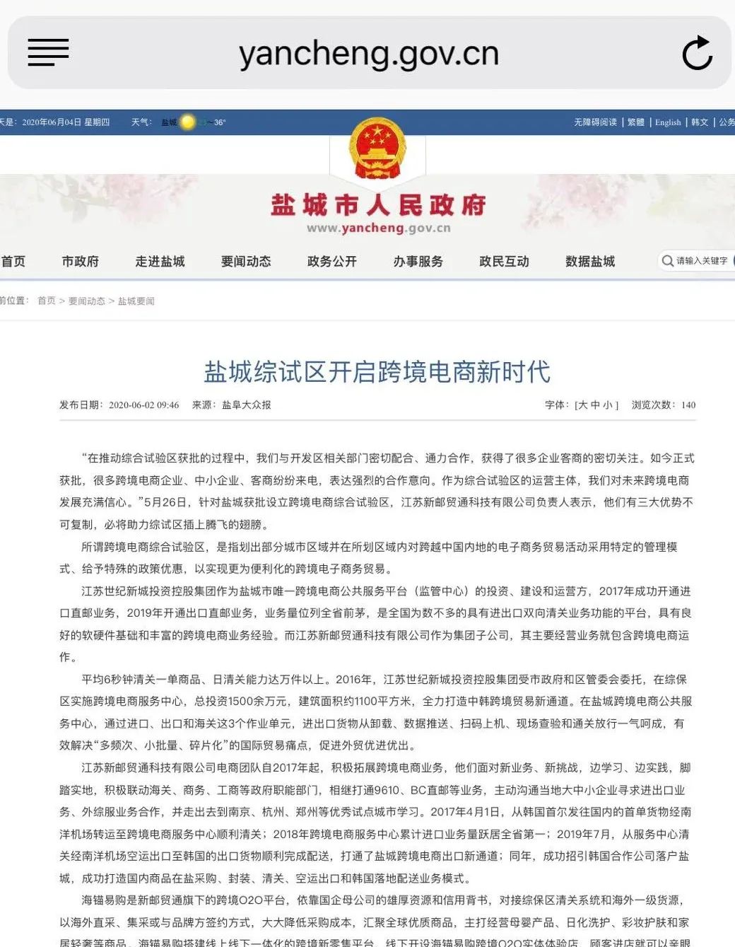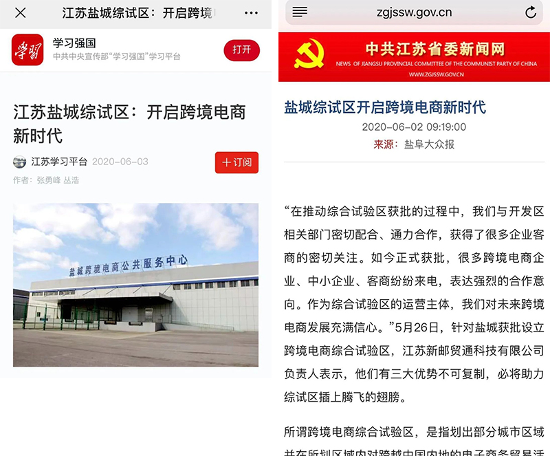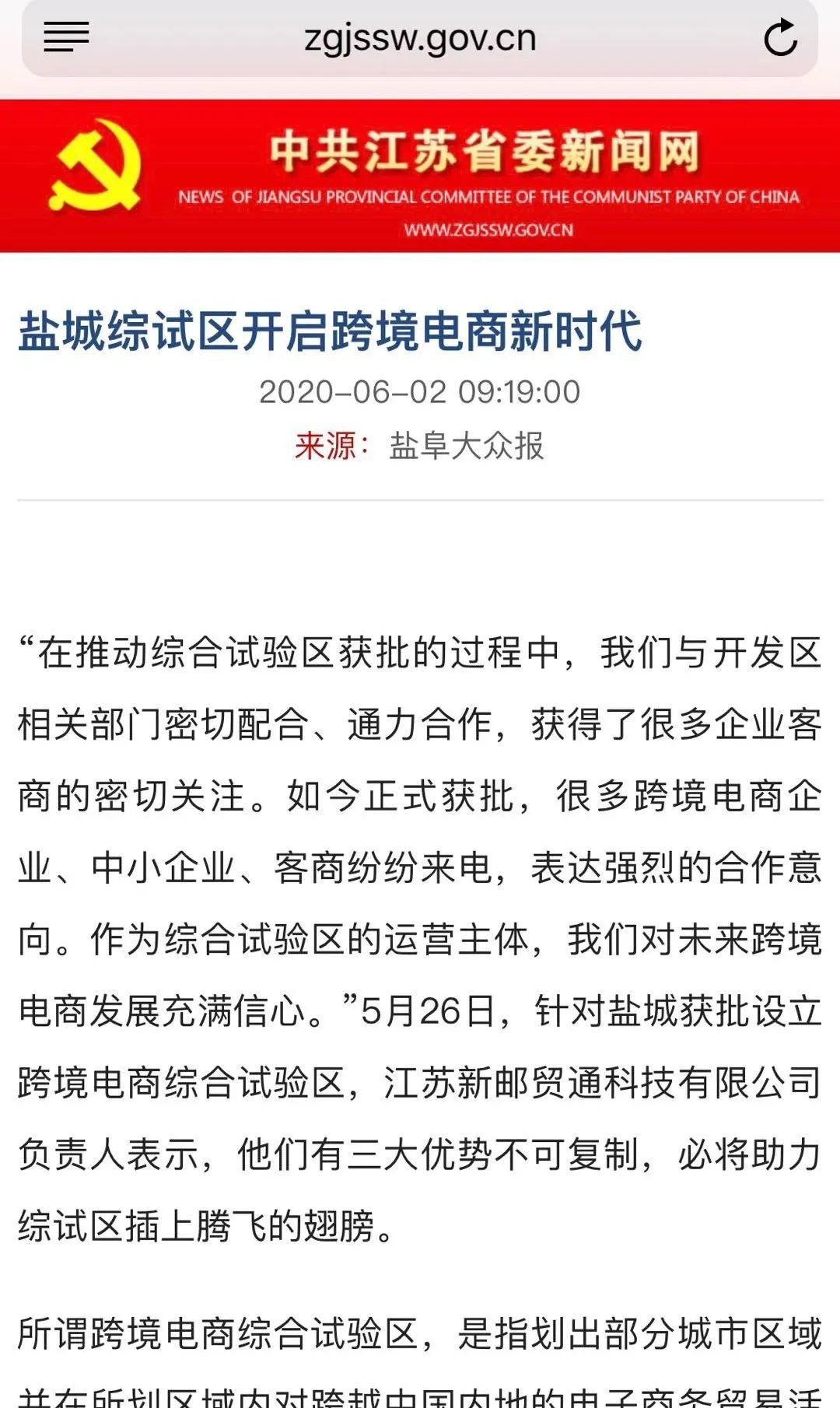 近日,“學(xué)習(xí)強(qiáng)國(guó)”APP、中共江蘇省委新聞網(wǎng)、鹽城市人民政府網(wǎng)站、鹽阜大眾報(bào)等多家主流媒體報(bào)道鹽城跨境電商“綜試區(qū)”。