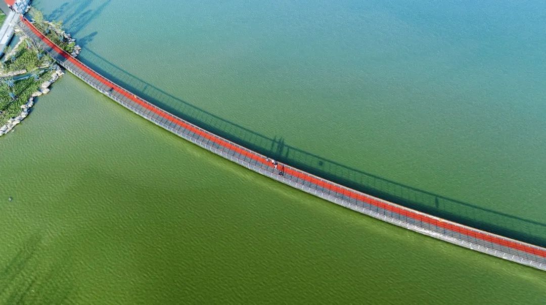 要寫長長的棧道蜿蜒曲折,連接著湖與岸,