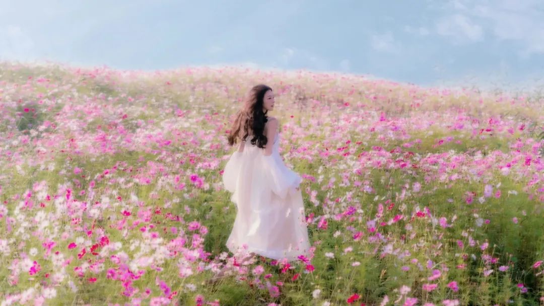 寫春風(fēng)拂過,粉色的地毯跌宕起伏,